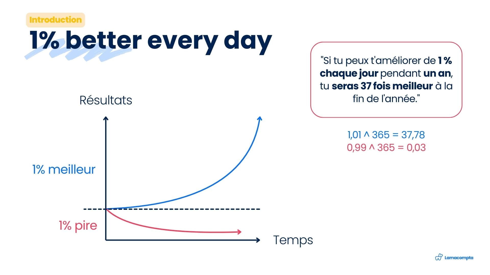 Si l’on progresse de seulement 1% par jour, l’effet cumulé fait qu’au bout d’un an, on sera 37 fois meilleur qu’au point de départ.