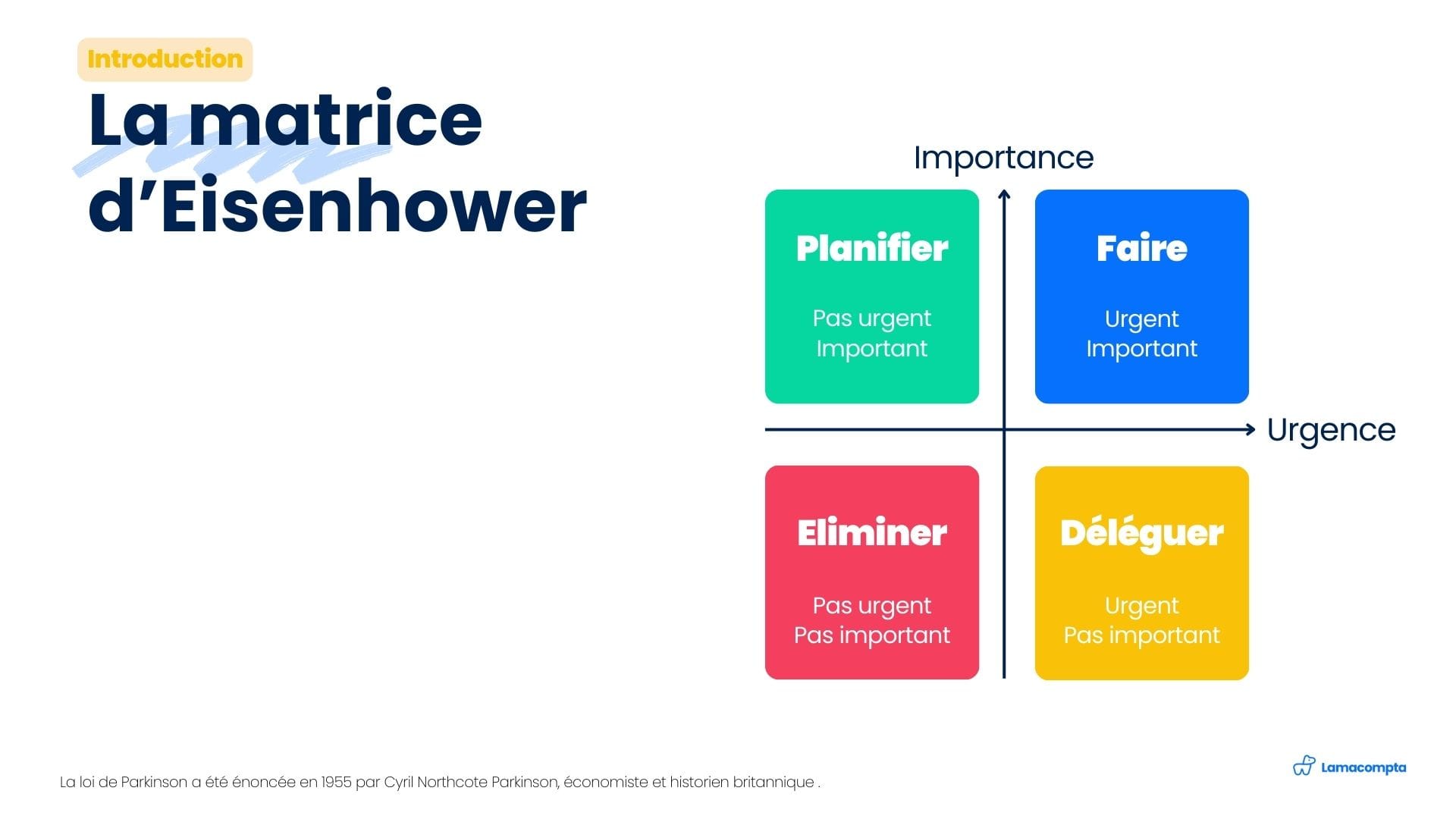 Inspirée du 34ᵉ président des États-Unis, Dwight Eisenhower, cette matrice est un outil puissant pour prioriser ses tâches. Elle classe les activités selon deux critères : l’urgence et l’importance.