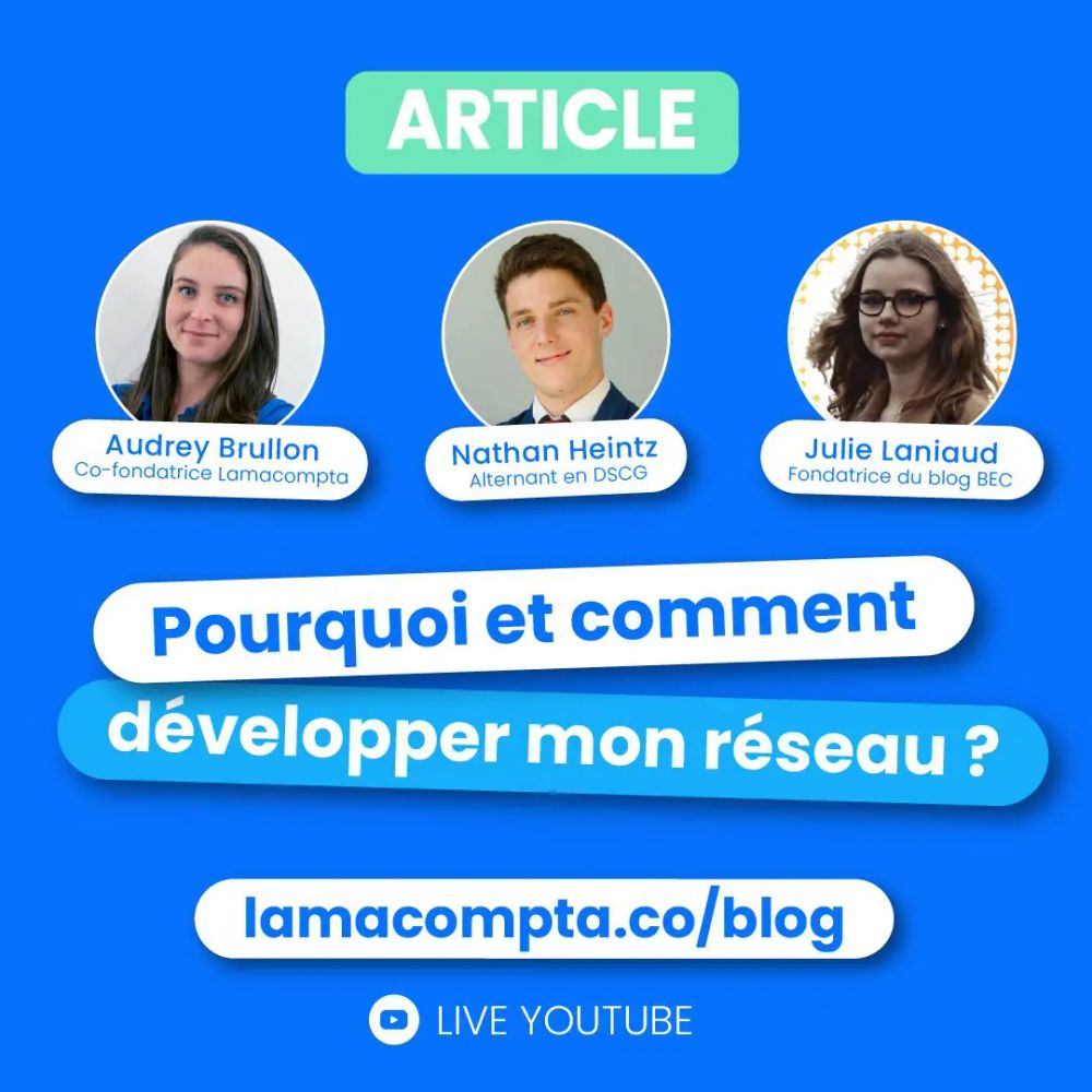 Audrey Brullon (Co-fondatrice Lamacompta), Julie Laniaud (Fondatrice du blog BEC ainsi que présidente de l’ANECS) et Nathan Heintz, Alternant en DSCG, vous expliquent dans un webinaire l’importance de développer un réseau pour soi-même, ses proches, et surtout pour atteindre ses objectifs professionnels. Le terme de réseau peut être angoissant, pourtant en appliquant ces conseils au quotidien, vous verrez une différence ! 🤗