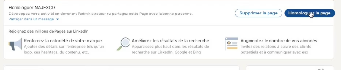 Une fois que vous avez ajouté le poste, vous pouvez accéder à la page de l'entreprise sur LinkedIn. Vous remarquerez qu'un bouton "Homologuer la page" s'affiche sur la page de l'entreprise.