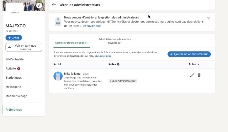 Enfin, vous pouvez gérer les membres et les administrateurs de la page. Vous pouvez ajouter autant d'administrateurs que vous le souhaitez et même vous retirer de la page si nécessaire.